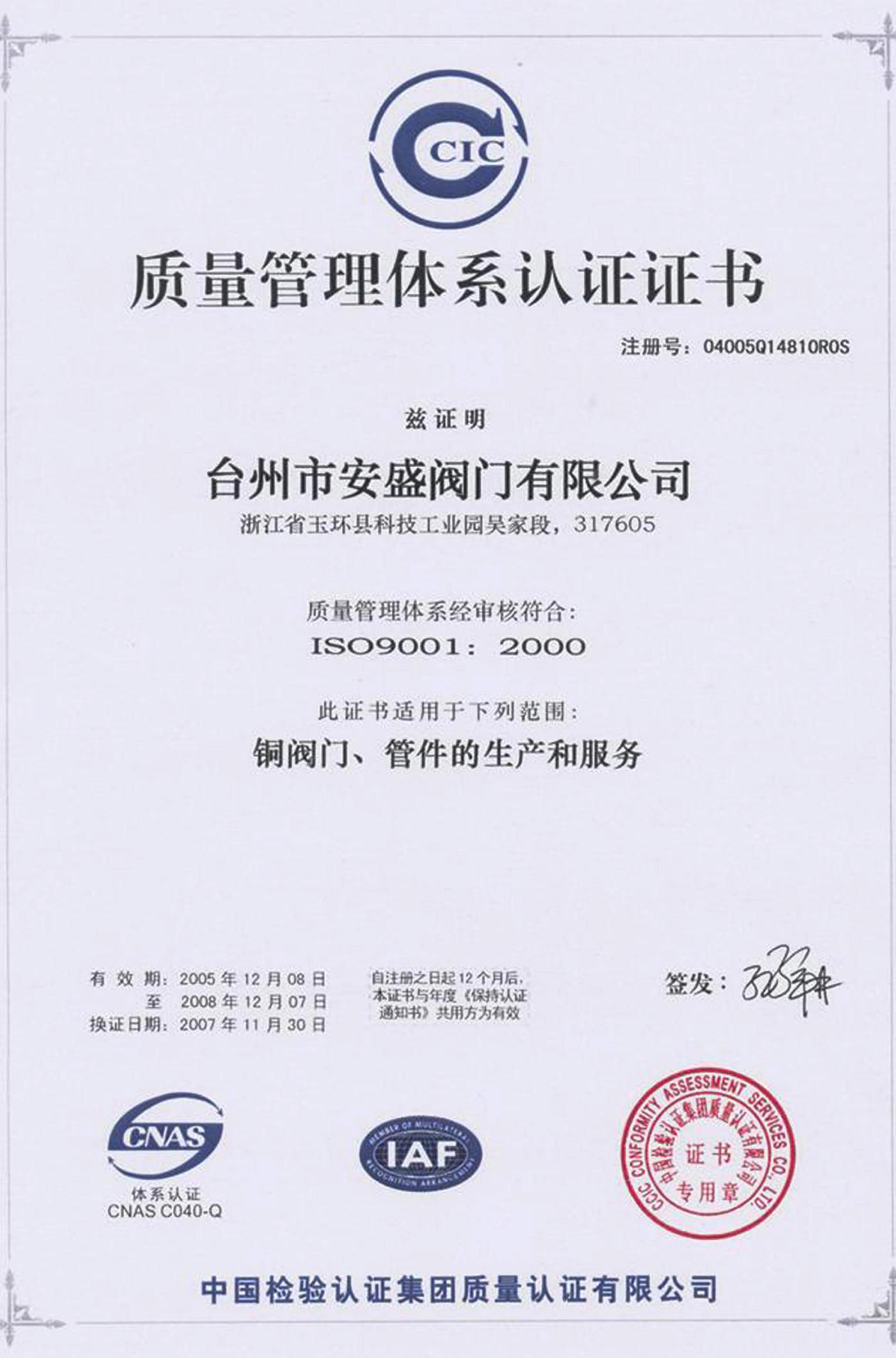 ISO 9001:2000質(zhì)量體系認(rèn)證證書